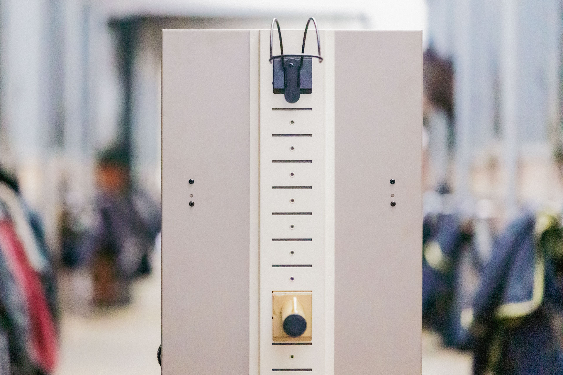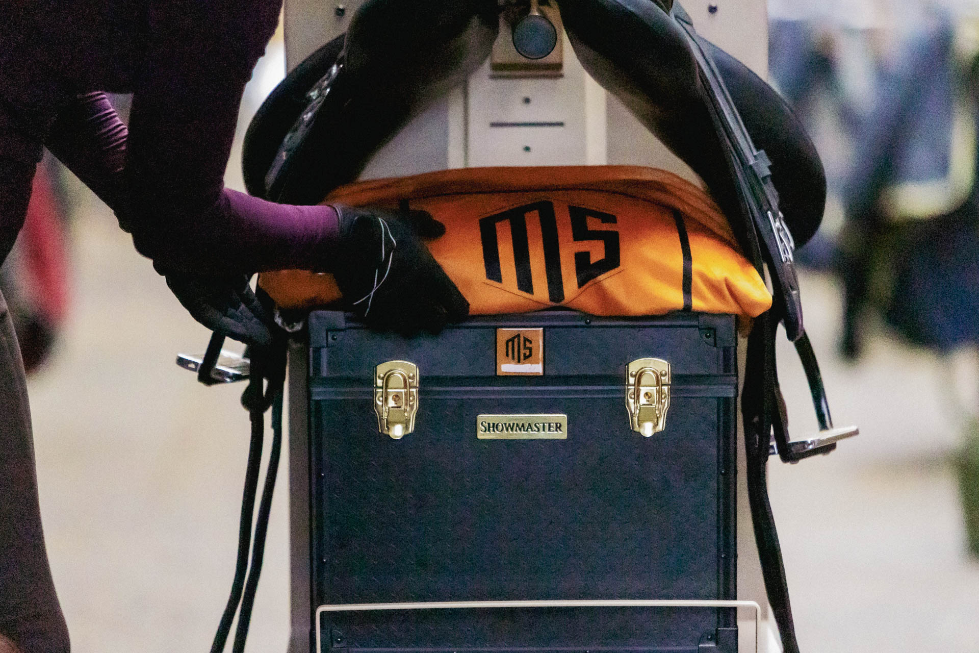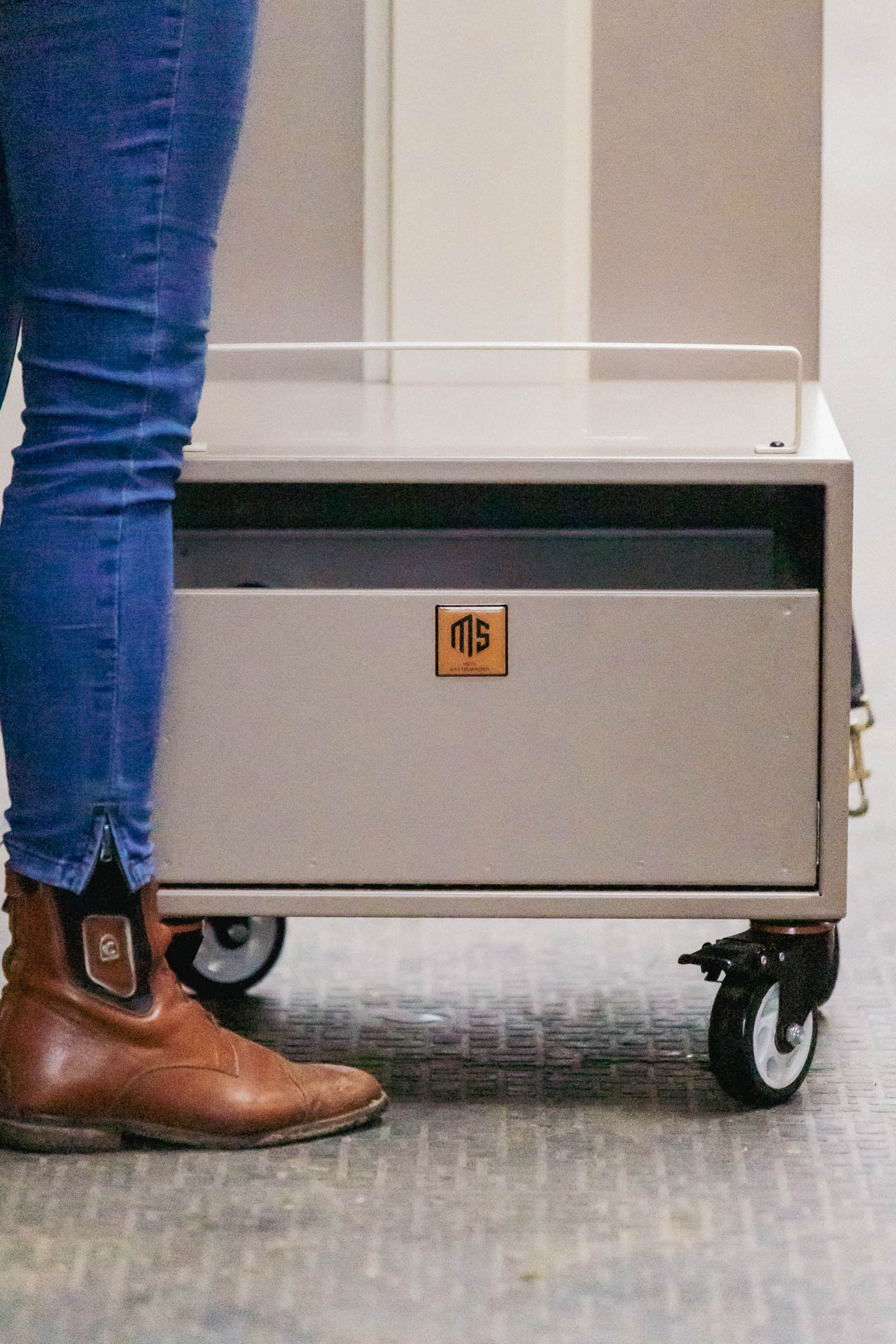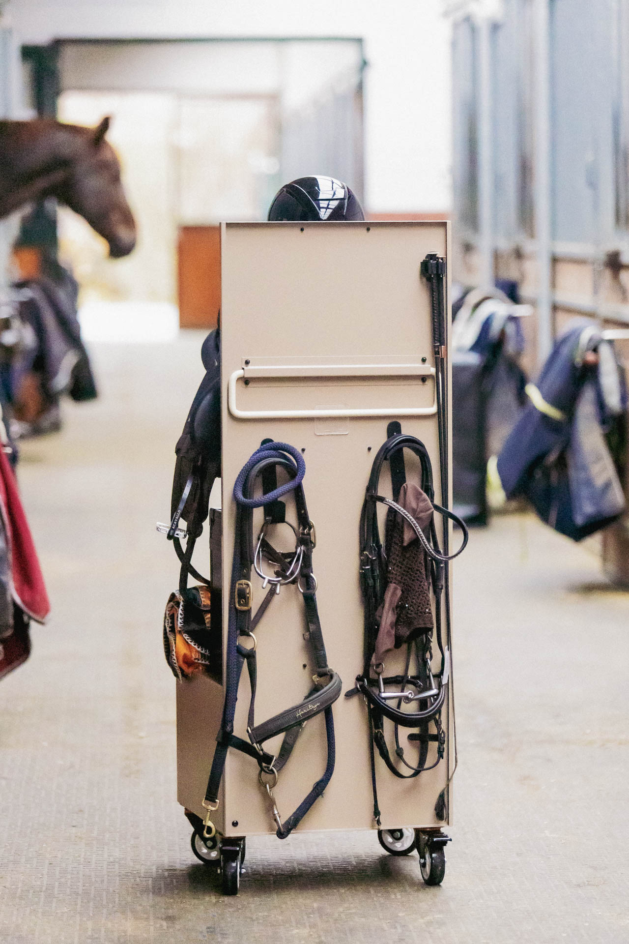 Grundgestell, bestehend aus Rollwagen mit integrierter Schublade und gelochtem Boden, mit einer großzügigen Rückwand zum Einhängen von Sattelhaltern und oder Reithelmhalter an der Vorderseite. Jeweils 1x Sattelhalter und 1x Reithelmhaltersind in der Basisausführung inklusive.